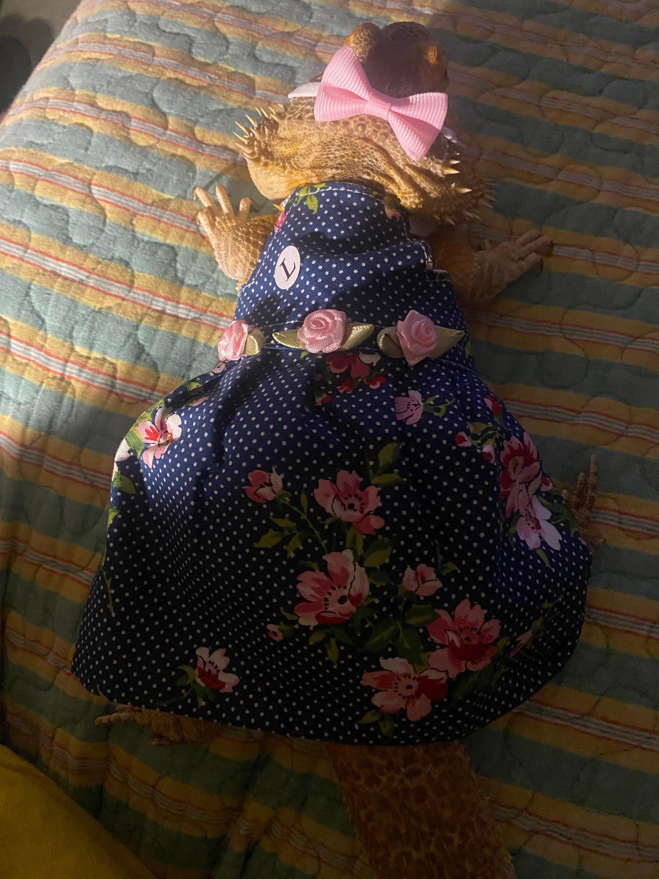 Adorable dress for Bearded Dragons! The bearded dragon in the photos is an adult female and a large fits her perfectly. (appliques may vary) Includes a super cute matching hat! The hat may only fit beardies that wear a medium or larger dress. MADE IN AMERICA