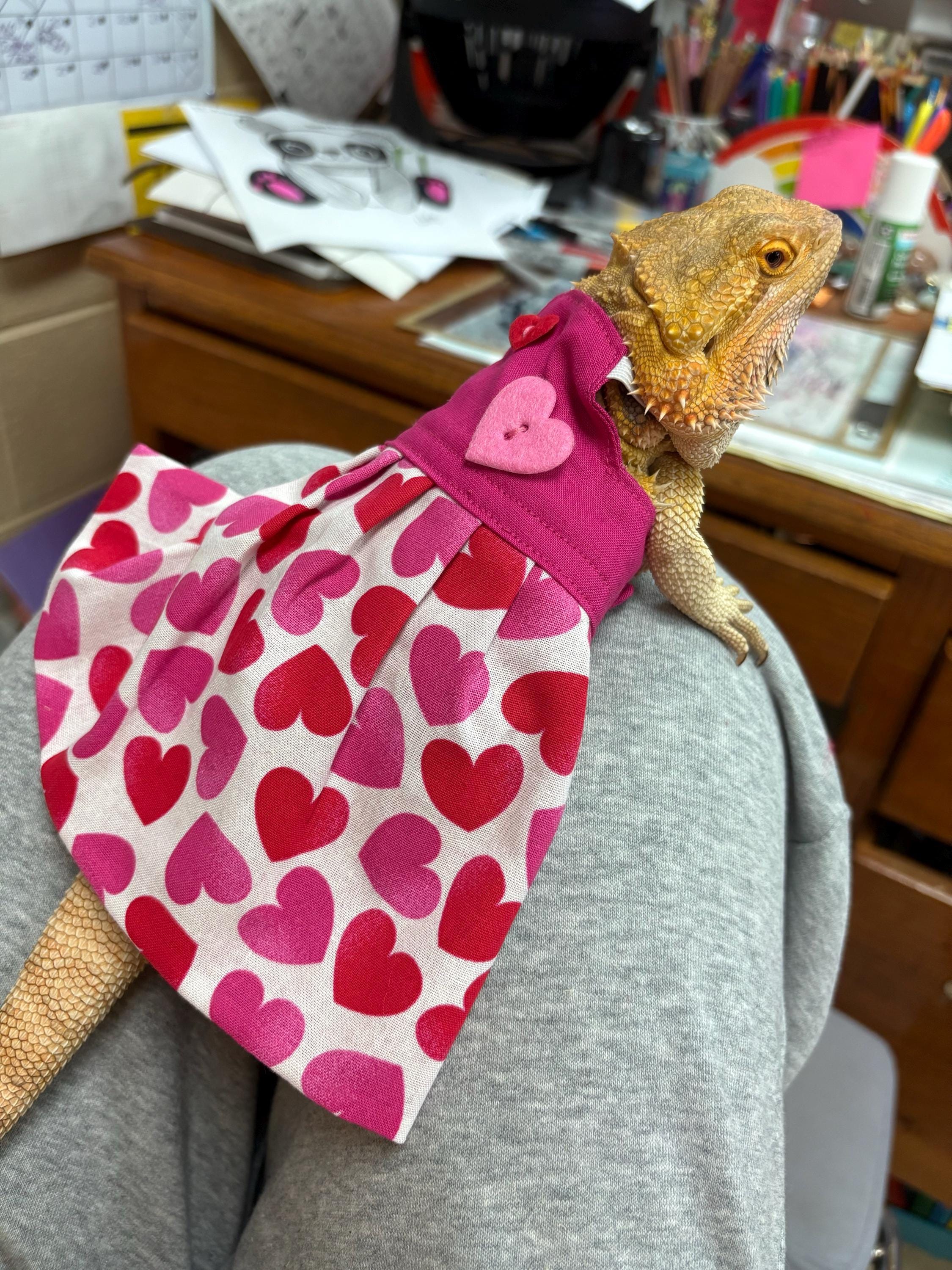 Adorable dress for Bearded Dragons! The bearded dragon in the photos is an adult female and a large fits her perfectly. (appliques may vary) Includes a super cute matching headband! MADE IN AMERICA