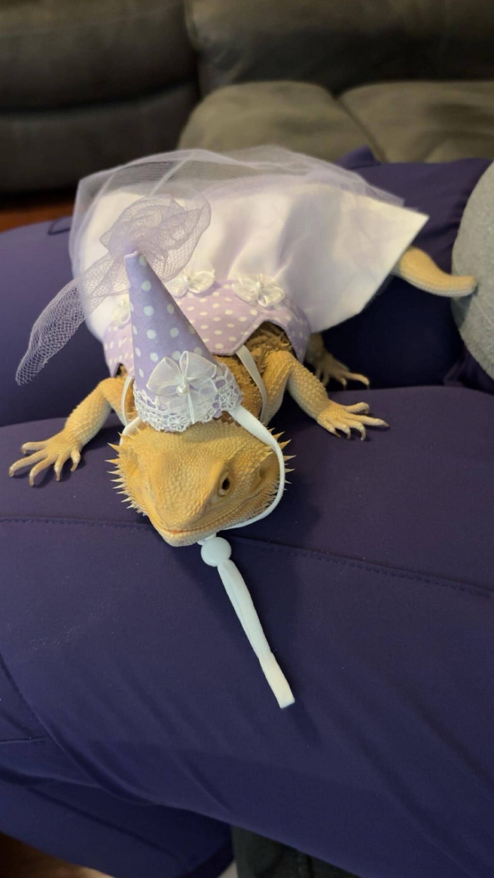 Adorable princess dress for Bearded Dragons! The bearded dragon in the photos is a 1.5 year old female and a large fits her perfectly. Includes a super cute matching princess hat! Perfect for a Halloween costume. MADE IN AMERICA