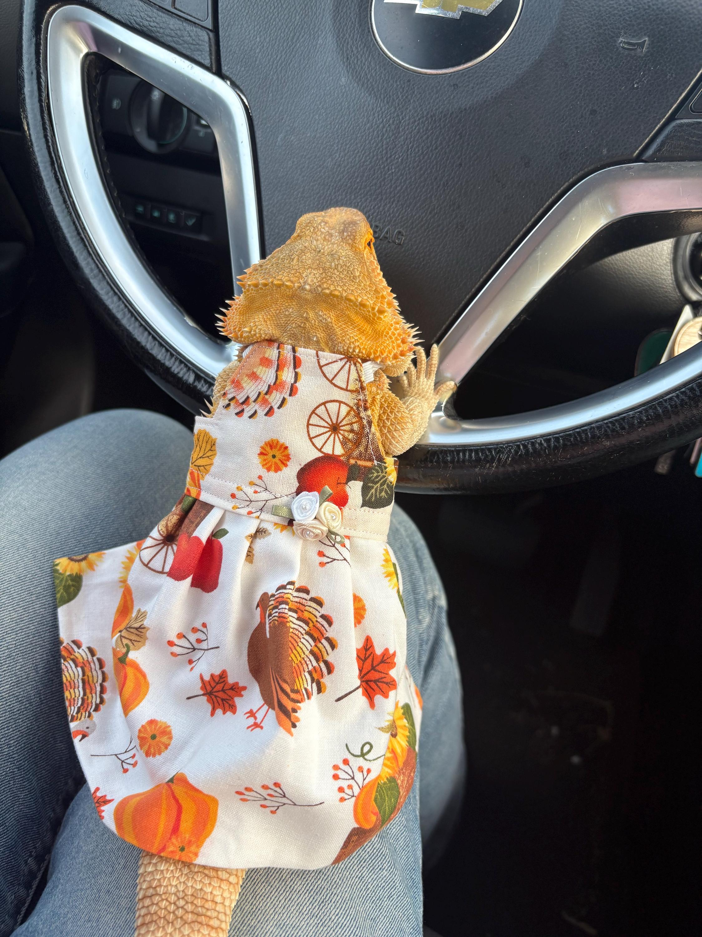 Adorable Bearded dragon dress. The bearded dragon in the photos is a 1.5 year old female and a large fits her perfectly. Made in America
